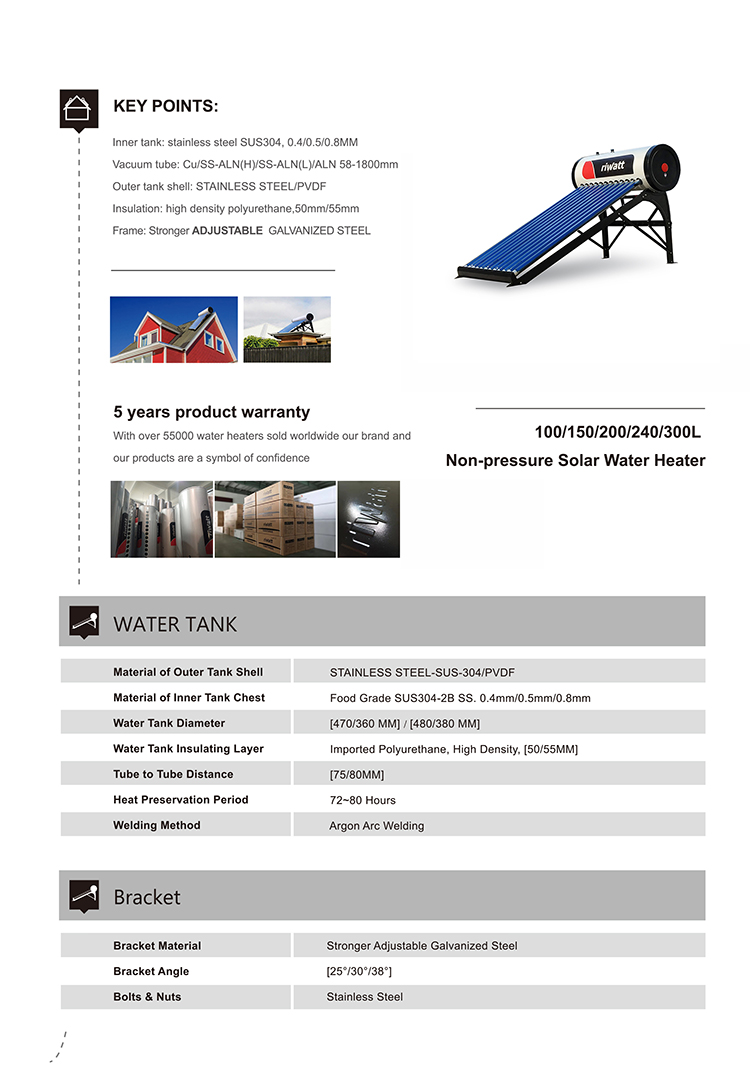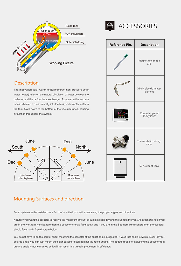 Introduction: The non-pressurized solar water heater (solar geyser) is based on the natural circulation thermosiphon phenomenon. It’s the most cost-effectiveness and environmentally friendly way to harness solar energy for hot water applications, which is unsurpassed by any other solar thermal products, for its most high efficiency, low cost and easy installation.